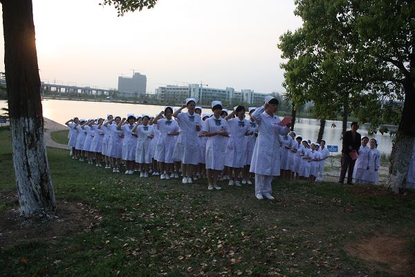 在南丁格尔的雕像前,伴随着庄严的音乐,09级护理同学直跪在护理前辈面前,老师们为她们戴上圣洁的燕帽,同学们接过老师手中的蜡烛,在孙国珍老师的带领下站在南丁格尔像前宣读誓言:我宣誓,谨奉人道主义精神,坚定救死扶伤的信念,履行“保护生命,减轻病痛,促进健康”的职责。我宣誓,遵守护士的职责道德规范,以真心,爱心和责任心对待每一位病人。永葆白衣天使的圣洁。我宣誓,求实进取,勤奋学习,忠于职守,热爱专业。我宣誓,永志今天的决心和誓言,接过前辈手中的蜡烛,燃烧自己,照亮别人,把毕生精力献给护理事业。