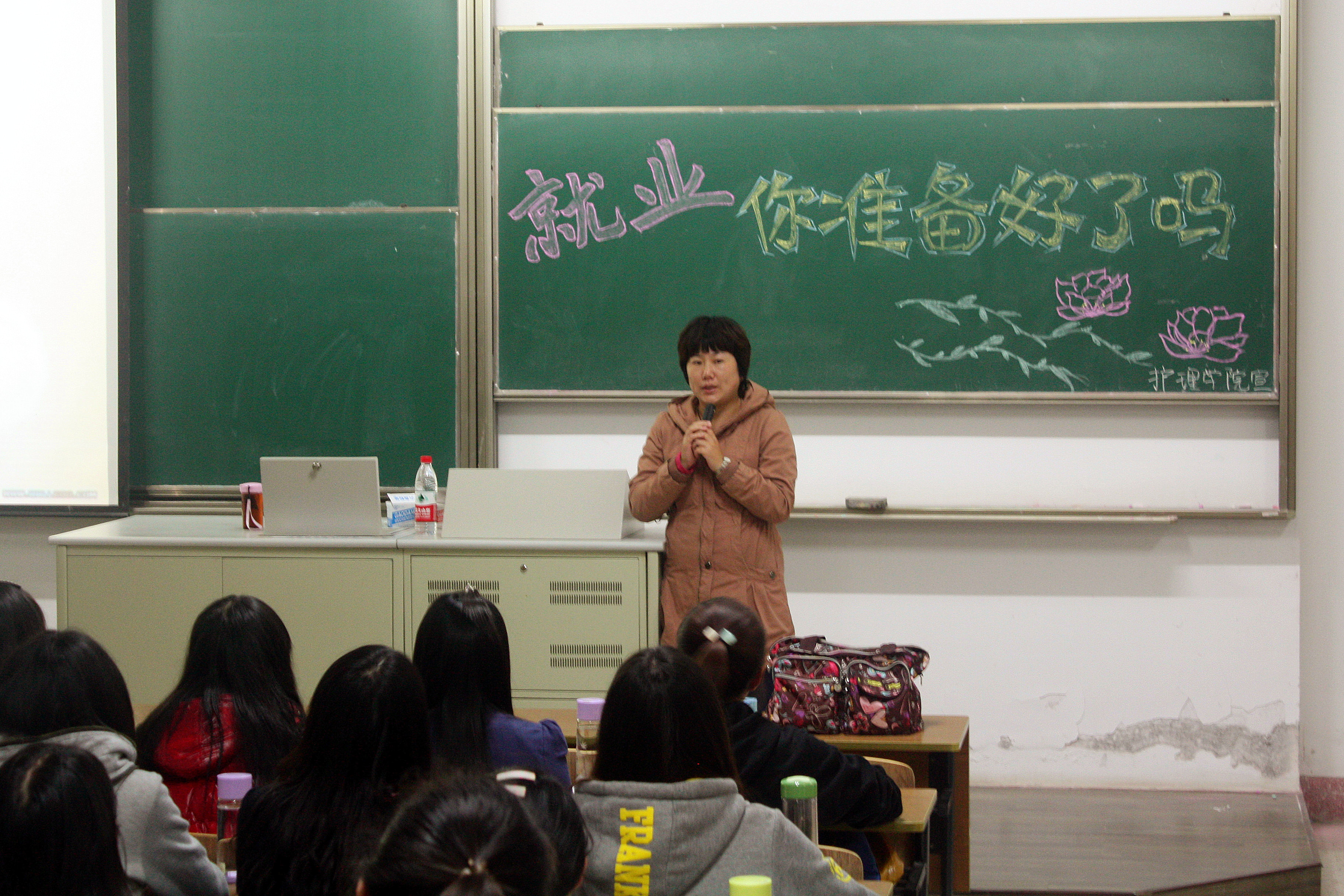 今年,徐老师的工作地点已由江宁转到了五台,但是在忙碌之余她仍抽出时间为11级的同学们做就业指导。教室里座无虚席,同学们十分珍惜这次机会,并准备好了做记录的纸笔。首先,徐老师抛出四个问题作为本次讲座的开场:1、就业,你思考过吗?2、你的目标单位在哪儿?3、你是如何选择自己的目标单位的?4、你为就业做了哪些准备?用这些问题引发同学们的思考后,徐老师才开始正式进入讲座内容。徐老师结合着2010级以及以往历届情况向同学们提出:第一要有一份好的成绩单;其次,她强调:“能力比成绩更重要”。这里的“能力”涉及了护基操作,求职面试,礼貌礼仪等各个方面,她指出:学院为同学们提供了很好的学习条件,从大二开始就已经开放了护基操作实验室,让同学们能够随时利用课余时间提高自己的操作能力;同时学院也开展了模拟面试活动,让同学们提前体验面试的氛围;另外,“淑女堂”以及各种礼仪讲座也为同学们传授了面试礼仪知识等等。她希望同学们能够珍惜这些机会,好好利用,为自己的就业提前做好准备。