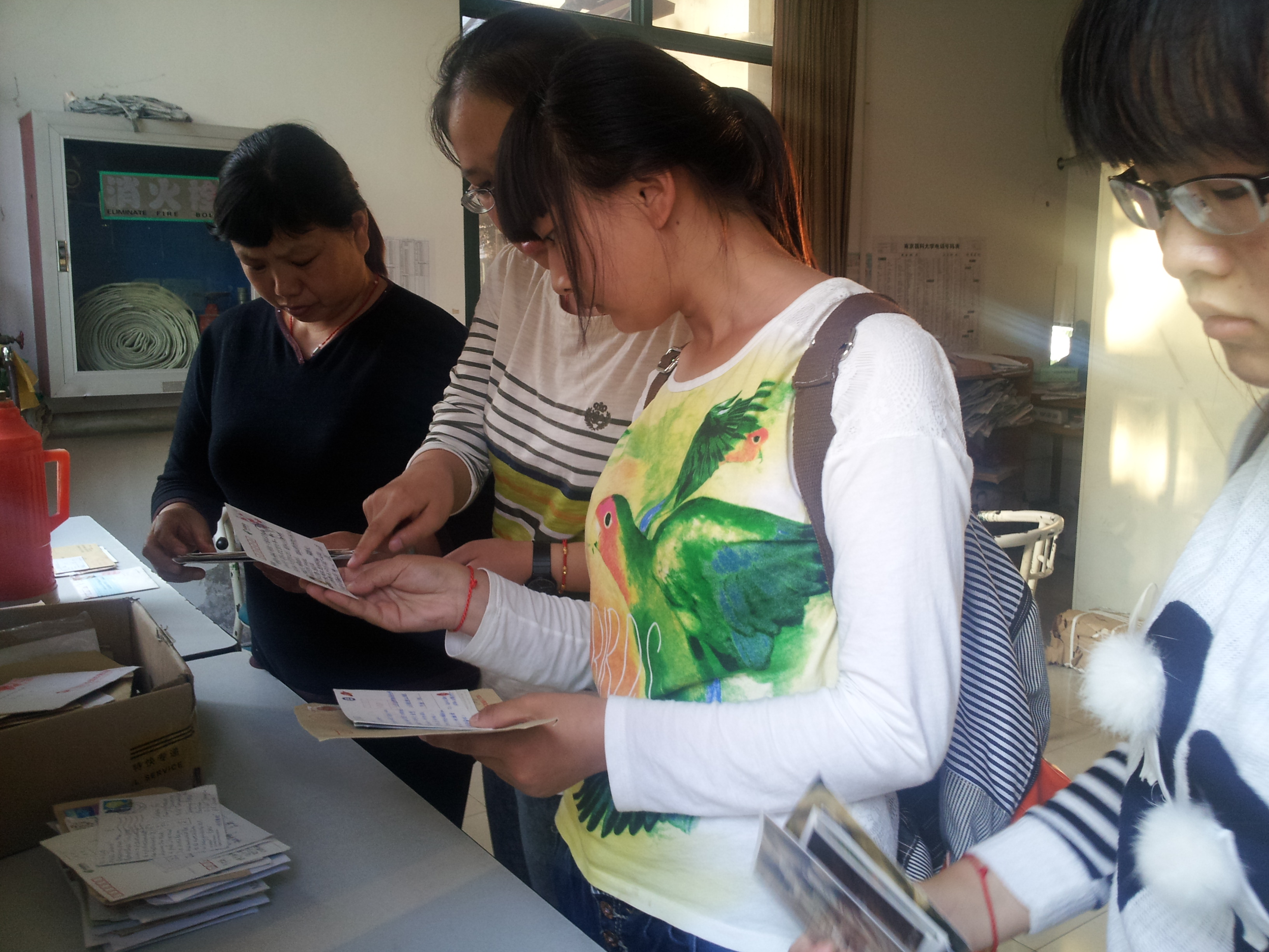 整理好了信件之后,我们便领了信件送往各个宿管站,和宿管阿姨说明了来意之后,她们很和善地接待了我们,并与我们拍照留念。在那些信件中却也不乏被退回的,我们一个一个的找到了信件的主人,将信件交还给他,看到他们脸上感激的神情,心情大好。