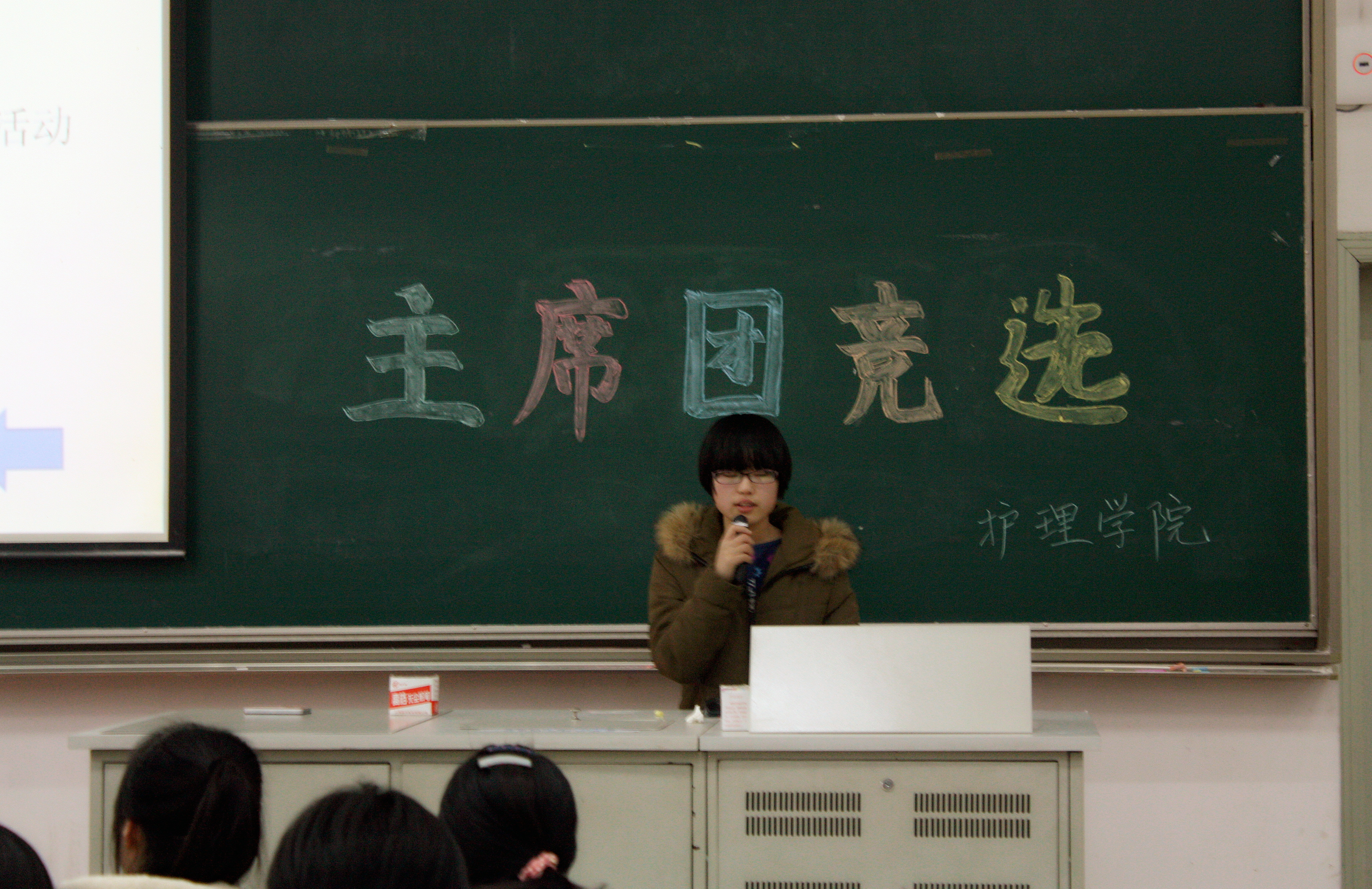 2014年2月24日下午4:30,我院在阶三举办了主席团换届竞选大会。此次大会邀请了王丽丽老师、吴菲老师、付梦楠老师和原主席团成员作为专业评委,同时,会议也请了各班学生代表担任大众评委。