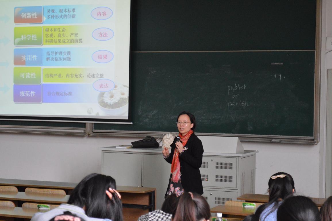 讲座伊始,许老师详细介绍了论文的定义,论文包括哪些形式以及什么叫研究,研究包括哪些要素。接着她讲述了完成论文的几大流程,包括填报申请书(课题名称、课题负责人等),开展科研(提出问题、文献查阅、假说形成等)以及完成论文(文题、引言、对象与方法等)。许老师通过介绍及比较多篇文献的方式详细介绍了护理学课题的研究方法:实验性研究、类实验性研究和非实验性研究。通过老师的介绍,同学们对这些方法的特性以及优缺点有了直观的认识。老师还强调:撰写论文应该遵守五大原则,即创新性、科学性、实用性、可读性和规范性。接下来在讲解撰写论文的要求和格式时,许老师带领我们一起分析了几篇论文,使同学们对于论文的结构以及撰写有了更深的认识。最后,老师总结了四句话:“一种思维,一个习惯,一本专著,不找借口。”这句话是对写好论文的一种要求也是对同学们的一种希望。