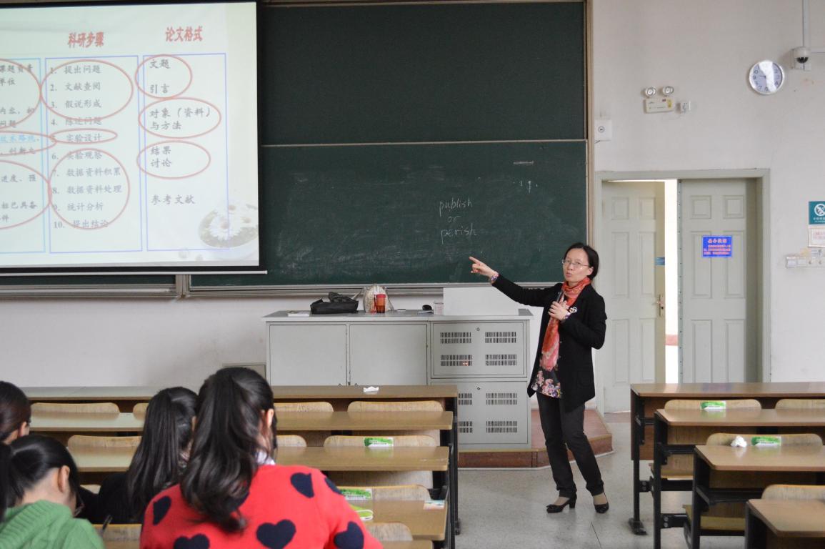 讲座伊始,许老师详细介绍了论文的定义,论文包括哪些形式以及什么叫研究,研究包括哪些要素。接着她讲述了完成论文的几大流程,包括填报申请书(课题名称、课题负责人等),开展科研(提出问题、文献查阅、假说形成等)以及完成论文(文题、引言、对象与方法等)。许老师通过介绍及比较多篇文献的方式详细介绍了护理学课题的研究方法:实验性研究、类实验性研究和非实验性研究。通过老师的介绍,同学们对这些方法的特性以及优缺点有了直观的认识。老师还强调:撰写论文应该遵守五大原则,即创新性、科学性、实用性、可读性和规范性。接下来在讲解撰写论文的要求和格式时,许老师带领我们一起分析了几篇论文,使同学们对于论文的结构以及撰写有了更深的认识。最后,老师总结了四句话:“一种思维,一个习惯,一本专著,不找借口。”这句话是对写好论文的一种要求也是对同学们的一种希望。