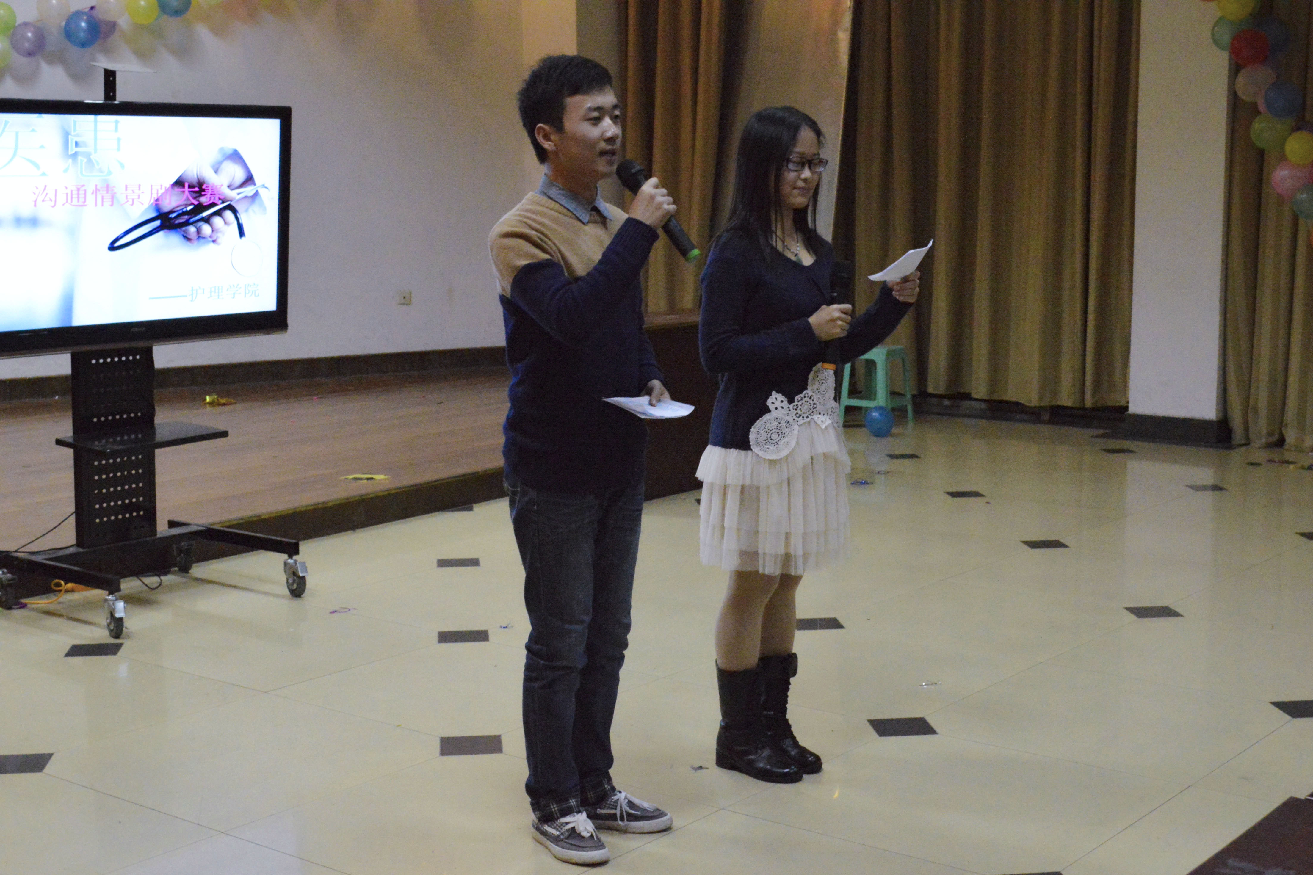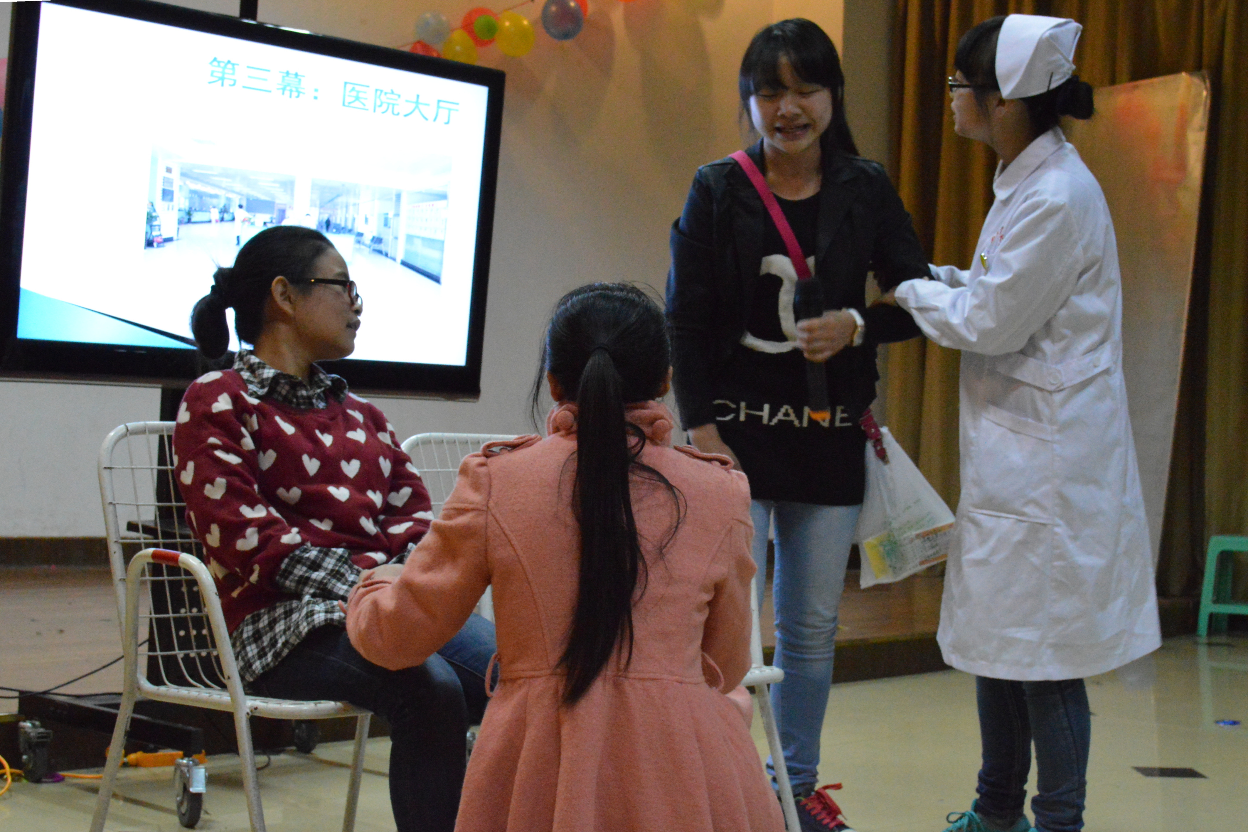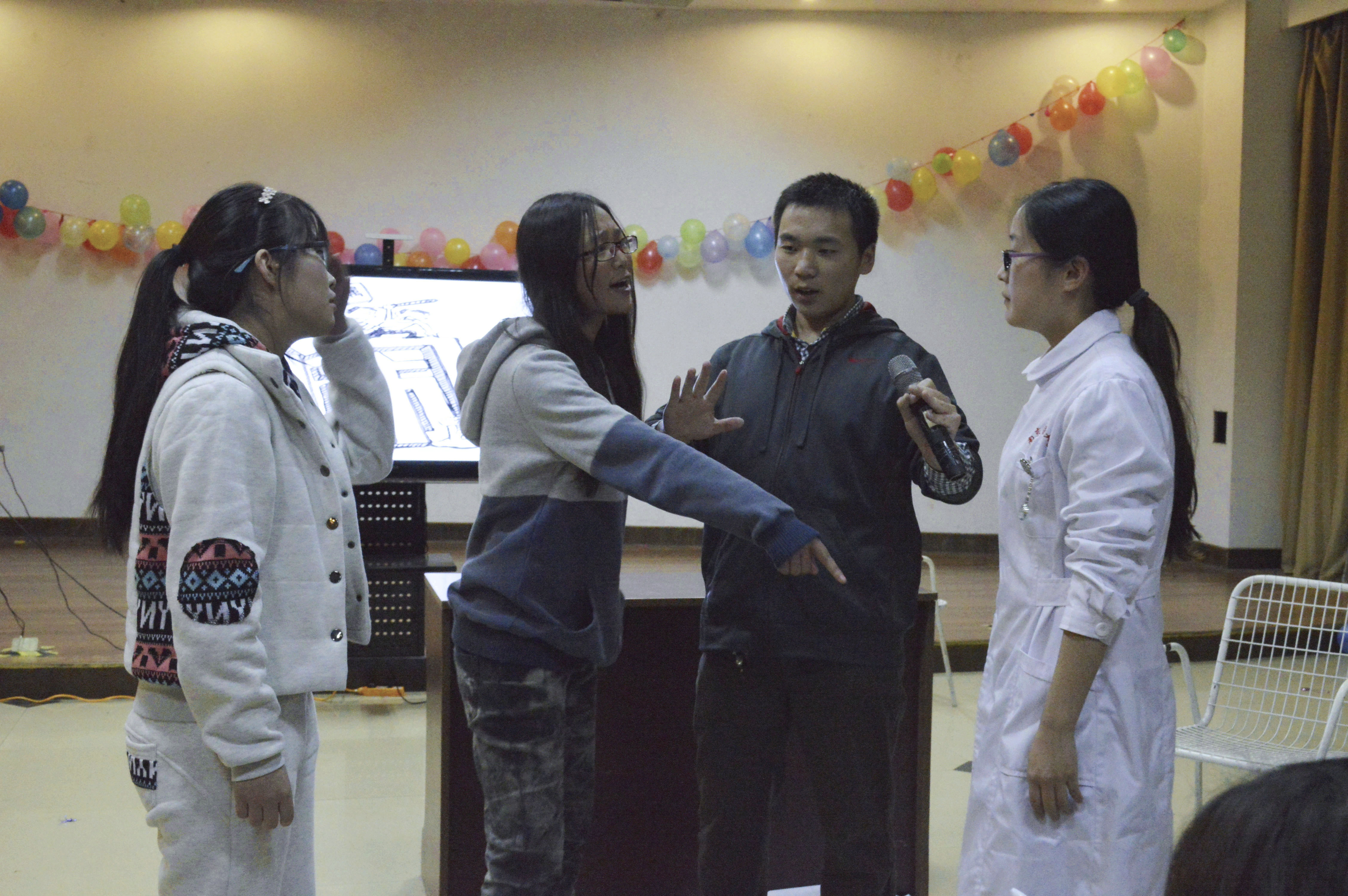演出前的一段视频让全场安静下来,大家都目不转睛地看完视屏,随着主持人的讲述,大家的热情顺势高涨。首先进行的是各组选手组长介绍自己的组员以及参赛作品主题,分别是:“关爱空巢老人”,、“生机”、“谐源于彼此理解”、“关注医疗,关爱生命”、 “领悟”、 “一盒降压药引发的血案”、 “深夜急诊科” 以及“医者仁心”。各组队员响亮地喊出自己的口号,14级4班的谢菲同学没有口号,但她用最真诚地话语:“我们没有口号,努力就好”赢得了大家的掌声。同学们表演的一举一动我们都看在眼里,记在心里。中场休息环节为有关“防火知识”的趣味比赛,只要回答就有奖品,瞬间带动全场气氛,大家都积极抢答。