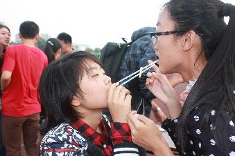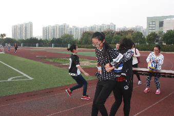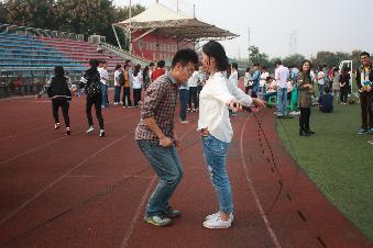 第二环节选手们转战到了网球场附近,首先他们需用两人三足的方式走到操场,操场四个角落会有四个不同的小游戏:用身体的任何部位压爆5个气球、双人跳绳20个、吸管传递洋葱圈和抽签选择身体的任意部位共同传递排球,最后再用两人三足的方法走到樱花坡,速度最快的三组晋级。大家都拼尽全力,速度最快的三组成功晋级。