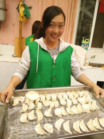 在与绿丝带活动组织者江医生交接任务以及进行了教育指导后,四名志愿者开始进行志愿活动。进入幸福园的后院,他们来到了厨房,这时工作人员刚剁完饺子馅,打算包饺子。四名志愿者便加入其中,共同为老人们准备晚餐。志愿者们用心包好每一个饺子,既要让它看起来美观,也要使它大小刚刚合适以便老人咀嚼。在进行了长达一个小时的包饺子活动,老人们的晚饭准备完毕。紧接着四名志愿者被安排到幸福园的内院与老人们进行亲切的交谈,深入的交流。