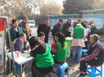 2015年11月14日是“联合国糖尿病日”,南医大MK体育(中国)蒲爱园青协四位志愿者与南京绿丝带义工围绕糖尿病日“健康饮食与糖尿病”主题宣传活动共同参加了方山社区糖尿病日志愿健康宣传。