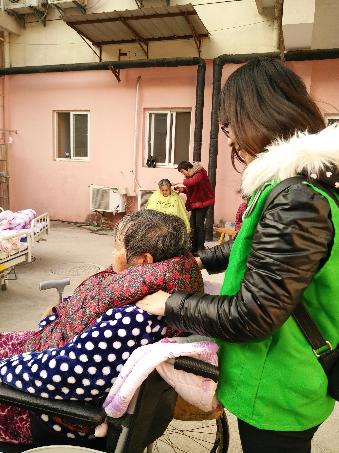 志愿者们跟着领队的节奏,开始慢慢接触老人,听不懂老人的话,没关系,用肢体表述,多问几遍,多些耐心,总会知道老人需要什么。她们以心交心,一步一步贴近老人的心,打破隔阂,叩开心扉。志愿者们为老人捏肩,捶背,剪手指盖,剪发……尽自己能做的来让老人感到丝丝舒适。最让她们感动的是老人们握住她们的手,用那呢喃的话语问她们:“累不累,歇会吧。”泪水模糊了眼眶,“不累,不累的,奶奶,力度行吗,还要大点吗?”她们仔细聆听老人们的年轻事迹,听着老人们的金戈事迹,体会老人们的骄傲……最终,庭院里,阳光下充斥的只有老人们舒心的笑声,点亮了那抹乌云,更点亮了志愿者们的心。