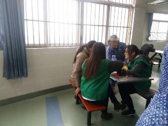 和往期的志愿者服务一样,大家在志愿者办公室整理材料,学习注意事项,然后分班级前往对应的病区。一部分同学去3病区,另外一部分同学去4病区。3病区是女病区,病患们相较男病区安静些,更喜欢画画唱歌下五子棋。她们也会看看书,特别喜欢志愿者们带过去的小书册。在志愿者的陪伴下,她们能够度过很愉快的早晨,安心的画一幅颜色明丽的画,唱唱喜欢的歌,再然后也可以打牌。男病区的病人并没有很多爱画画的,他们喜欢看些战争题材的电影,也喜欢写毛笔字看杂志报纸。志愿者整理出带来的材料,就参与到其中,陪伴他们打牌或者下棋。志愿者们的棋艺一般,在陪病人下棋的过程中也学到了很多。病人们或许有着一点点精神方面的障碍,然而他们身上又有着那么多的闪光点,病人们给大家带了的不是一点点的惊艳。他们甚至可以清晰的整理出一栋大楼的造价该如何评估,在说着这些的时候,他们是多么的开心,甚至能够看到他们眼中闪过的光芒。而作为他们的志愿者们,大家有幸感受到了他们的纯真,他们的快乐。