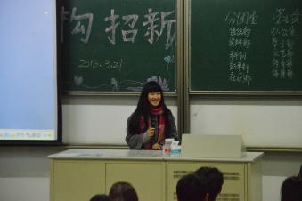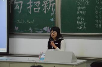 招新还未开始,已经有很多15级同学来到阶梯教室了,期待着招新工作的开始。六点半招新工作正式开始,首先由各部门部长进行部门介绍,各部长的介绍都各具特色,有的幽默风趣,将在场的新生的目光都吸引住了,有的严谨认真,希望招到有一技之长的人,当然也有些人坦言对于进部门没有特别要求。