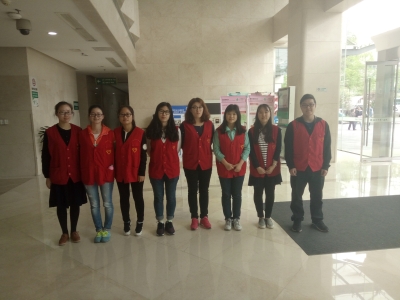 到了医院,待大家陆陆续续地穿上志愿者的红色标志服装后,一位很和善的保安叔叔帮志愿者们拍了照,作为留念。