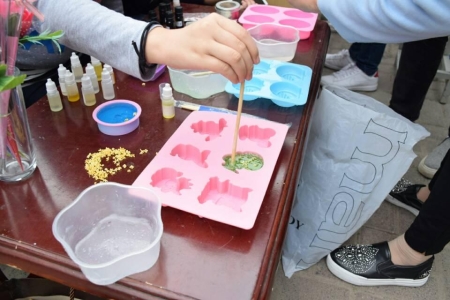 一块块色彩纷呈的手工香皂,外表美观、馨香宜人,受到广大同学的青睐。上午11时许,班级志愿者早已把制作香皂的模具、材料等准备就绪,一边着手制作、一边等待着同学们的到来。一时间,整个空气中馨香四溢。爱美之心人皆有之,许多闻香赶来的同学抵不住诱惑,纷纷参与到制作中。有的拿出了自己晒的桂花,加入到香皂中。形状各异的模具,芳香四溢的香皂材料,同学们纷纷选好了自己心仪的那一款,耐心等待着香皂的完成。由于此次活动只有前30名登记的幸运儿,可以免费地获得了我们自制的手工香皂。加之自制的香皂完全是现场制作,所以每一个香皂都需要时间来制成、包装,感谢每一位同学的耐心等待。现场还准备了花语征集册,有近50位同学将自己最喜欢的花及其花语登记在了上面。