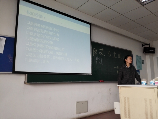 12日下午,在南师大的交流会由南师大红十字会学生分会副主任侯学仁主持,由我校生殖健康同伴社为宣讲主体。