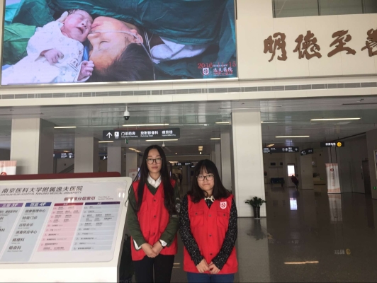 20161115日,南医大15级护理8班的两位同学凡苏越和任颖在南京医科大学附属逸夫医院做志愿者,其中一个被分在大厅,另一个在B超室。