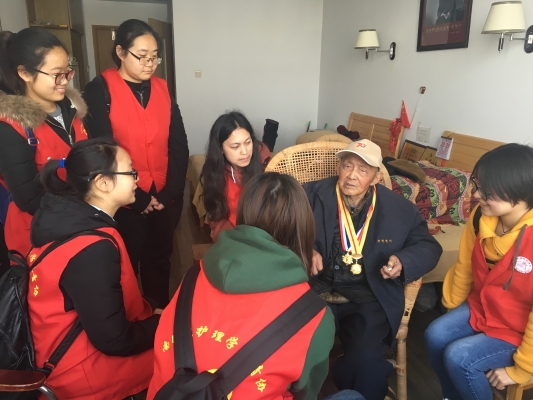 2017326日上午10:3012:00,南医大护理青协16级的吴蕊含、明艳、张曼曼、陆屹、陈小淑、郭晶晶和古扎努儿吐尔逊等7名同学来到江宁荣平医院看望三位抗战老兵,钱爷爷、葛爷爷和曾爷爷。