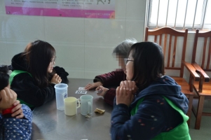 另一组同学前往了三病区,三病区的病人们对于志愿者们的到来显得很热情。一进去,就有几位阿姨热情邀请同学们一起打牌,还有一位奶奶与志愿者们一起认真的研究起带过去的听歌机。原先几位看电视的病人也被吸引了过来,邀请志愿者一起玩五子棋。两个小时的时光很快过去,离开时病人们都显得依依不舍,其中一位奶奶一直趴在窗口跟同学们挥手,即使我们迈出了房间也能听到她一直在跟志愿者们说再见,让同学们下次再去。