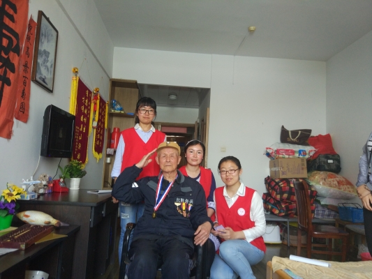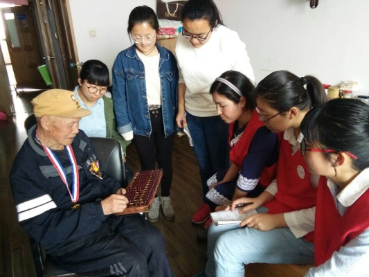 上午10时许,在领队的带领下,志愿者们开始走进抗战老兵们的房间。由于曾爷爷的回家,此次志愿者们和2位老兵进行了交谈与聆听。志愿者们把热情和快乐带给了每位老兵,老兵们对同学们的娱聊感到非常欣慰。