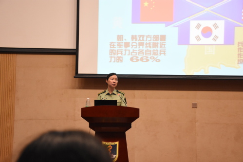 讲座伊始,叶教授用世界五大力量中心引出中国周边安全环境面临的威胁与挑战。继而,她就朝鲜半岛的问题作出了详细的分析与讲解。她向同学们提出了解决朝鲜问题的关键在于解决朝鲜核问题,朝核问题已影响东北亚局势,由此导致美、俄、日、朝、韩对待朝核问题态度不一。叶教授还分析了半岛战争对中国的挑战和影响,她指出中韩关系无进展,朝核问题影响国家战略地位,破坏周边环境及国家安全利益可能导致人道主义危机,如难民潮等。