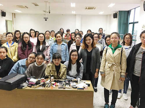 首先,老师用PPT向同学们大致介绍了化妆的基本步骤以及日常护肤的注意事项,接着老师请了一位模特坐在讲台上,亲自给同学们演示化妆的步骤。课堂上,同学们都积极踊跃。为了能更好地看清老师的化妆步骤,不少座位靠后的同学都挤在了前排。有的同学不时地拍着照片,也有同学直接把老师的化妆步骤用手机录了下来。菲菲老师十分和蔼,也很有耐心,每进行一个步骤,都仔细地跟同学们讲解注意事项,同学们也时不时地向老师提出自己平日化妆时的疑惑。