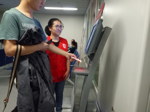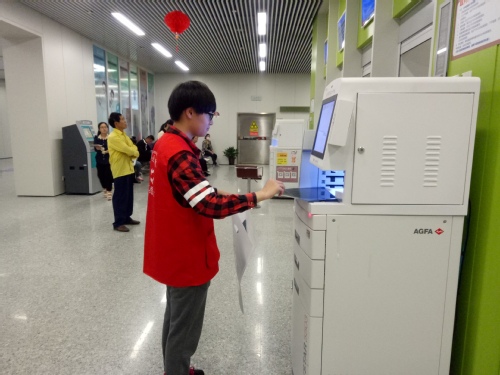 志愿者们签过到后,换上红马甲,奔赴各自的岗位。潘艳红同学在二楼的B超室,她站在自助叫号机旁,引导病人扫描挂号单上的条形码排号。上午B超室的人流量很大,但是志愿者还是耐心地提醒每个病人或家属,“做B超检查请往左手边找护士,做心电图检查的请到这里扫码排号。”志愿者亲切的提示,既便捷了病人,也提高了科室的工作效率。李梦悦同学在影像科,除了在叫号机旁帮助病人排号外,还协助护士取拍好的片子。科室里人来来往往,有些嘈杂,但是志愿者还是一丝不苟地坚守岗位,协助医护人员为病人们提供暖心服务。朱佳甜同学则在大厅帮助病人下载逸夫医院app,在手机上挂号、缴费等,简化看病流程。有一位初次来逸夫医院的年轻人就尝试了手机挂号和缴费。看完病,当他走出医院前对志愿者的感谢让志愿者深切感受到助人为乐的满足感。