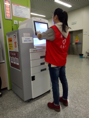影像科岗位的志愿者在逸夫医院工作人员的指导下粘贴条形码,使用自助打印机扫描条形码打印病区影像报告,整理影像报告资料,并指引前来就诊的患者排队登记预约,指导患者及其家属如何使用自助打印机打印影像报告,提醒就诊患者领取自己的影像报告。有位哭闹的小朋友,志愿者安慰逗乐在哭闹的小朋友;搀扶行动不便的患者,帮助患者检查预约。