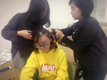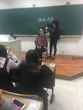 同学们刚开始有一点羞涩,但是当菲菲老师开始实际操作的时候,同学们便纷纷上前,围住老师和模特,仔细观看,更有不少同学拍摄视频并将其上传至QQ群里分享给所有同学,老师每教完一种款式,同学们便回到座位上,两两一组,互相帮助,脑海中回忆刚才老师教的步骤,并在同伴的头上进行操作。同学们都很认真地互相编发,老师也在同学们周围走动,还时不时地纠正同学们的错误手法并手把手教正确的手法。这一堂课老师一共教了三种发式,这三种发式都既实用又美观,有不少心灵手巧的同学已经学会了,在课程快要结束的时候,淑女堂的同学们纷纷表示要回去教会宿舍里的所有人,让自己和舍友都可以美美地出门!