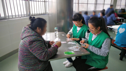 随后志愿者们拿出带来的象棋、扑克牌、画笔、彩纸等和病人们玩耍起来。有的病人酷爱画画,他们用彩笔在纸上画出他们心中美丽的世界,画出心中属于他们的礼服;有的病人则喜欢唱歌和跳舞,伴随着音乐声跳起了《小苹果》,志愿者们纷纷为她鼓掌;有的病人则和志愿者一起折起了手工,不一会儿桌上就出现了许多的爱心、千纸鹤、气球等;有些病人会拿着扑克牌去玩,同学陪着他们,一起聊天打牌。