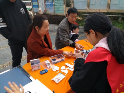 3月25日清晨志愿者领队戴雨婷带着成员杨海燕、刘云、熊正艳、吴怡雯等五人来到方山社区进行义诊活动,志愿者们到活动地点后都各自忙碌起来,有人负责抬桌子,有人负责拿板凳……爷爷奶奶们也已经在边上等着志愿者们给他们测量血糖血压,同学们把仪器摆好后很快地进入状态,各司其职,也不忘团结合作。