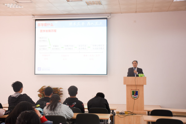 接着,赵书记围绕“医学与健康”这一主题与同学们进行了分享与交流。他引用了瑞典医学家福尔克 汉森的名言“人类的历史就是其疾病的历史”和医学经典《西氏儿内科学》中“医学是一门古老的学识渊博的仁慈的职业”,让我们对医学有了一个大致的概念。接着,赵书记从医学的发展历程、医学与科学文化和宗教的关系、现代科学的发展对医学的利弊等方面深入讲解,让学生们更加了解医学,并且重点说明了卫生领域及医院现下面临的形式与挑战,例如收支、医患纠纷方面。