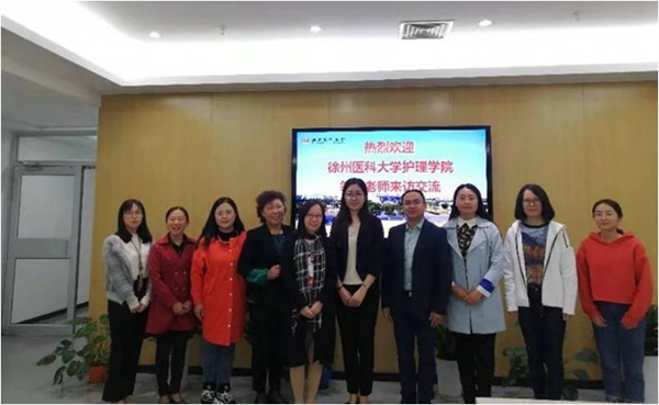 10月12日下午,徐州医科大学MK体育(中国)副院长周芳一行六人来院考察交流。院领导许勤、丁亚萍,基础与社区学系、护理实验示范中心、科教办老师参加接待。