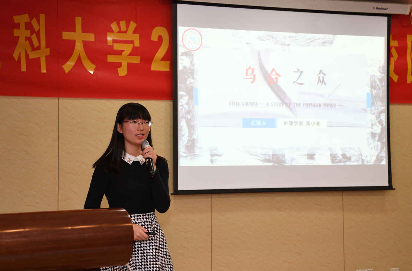 蒋小曼同学向大家分享的是法国社会心理学家古斯塔夫·勒庞的《乌合之众》。《乌合之众》是一本非常经典的心理学著作,蒋小曼同学从书里的基本观点出发,结合膜拜杨超越、崔永元事件等例子分析了群体心理的特征,并用自己的观点向大家展示了这本著作的独特魅力。其出色的表现赢得评委的一致认可,最后荣获本次读书报告会的一等奖。