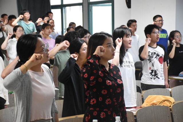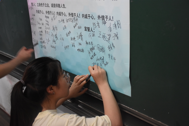 随后,学院勤学部副部王婧同学带领受助学子进行诚信宣誓——“诚实守信,立身之本;人人诚信,道德日兴;社会诚信,和谐文明。我郑重承诺:我要做诚信公民……”。教室里,气氛庄严肃穆,每一位同学都举起右手,高声宣誓。结尾时坚定地喊下自己的名字,这是大家对誓言的庄严承诺。