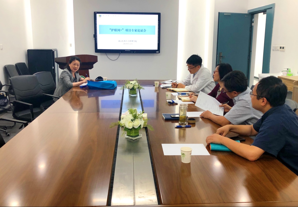 2019年5月23日下午14:30,学院“护联网+”项目专家论证会在学海楼C504召开,江苏省护理学会老年护理专委会主任委员刘世晴、校信息化建设与管理处主任谢健担任指导专家,院领导林炜、许勤及基础与社区护理学系副主任李现文参加了论证会。