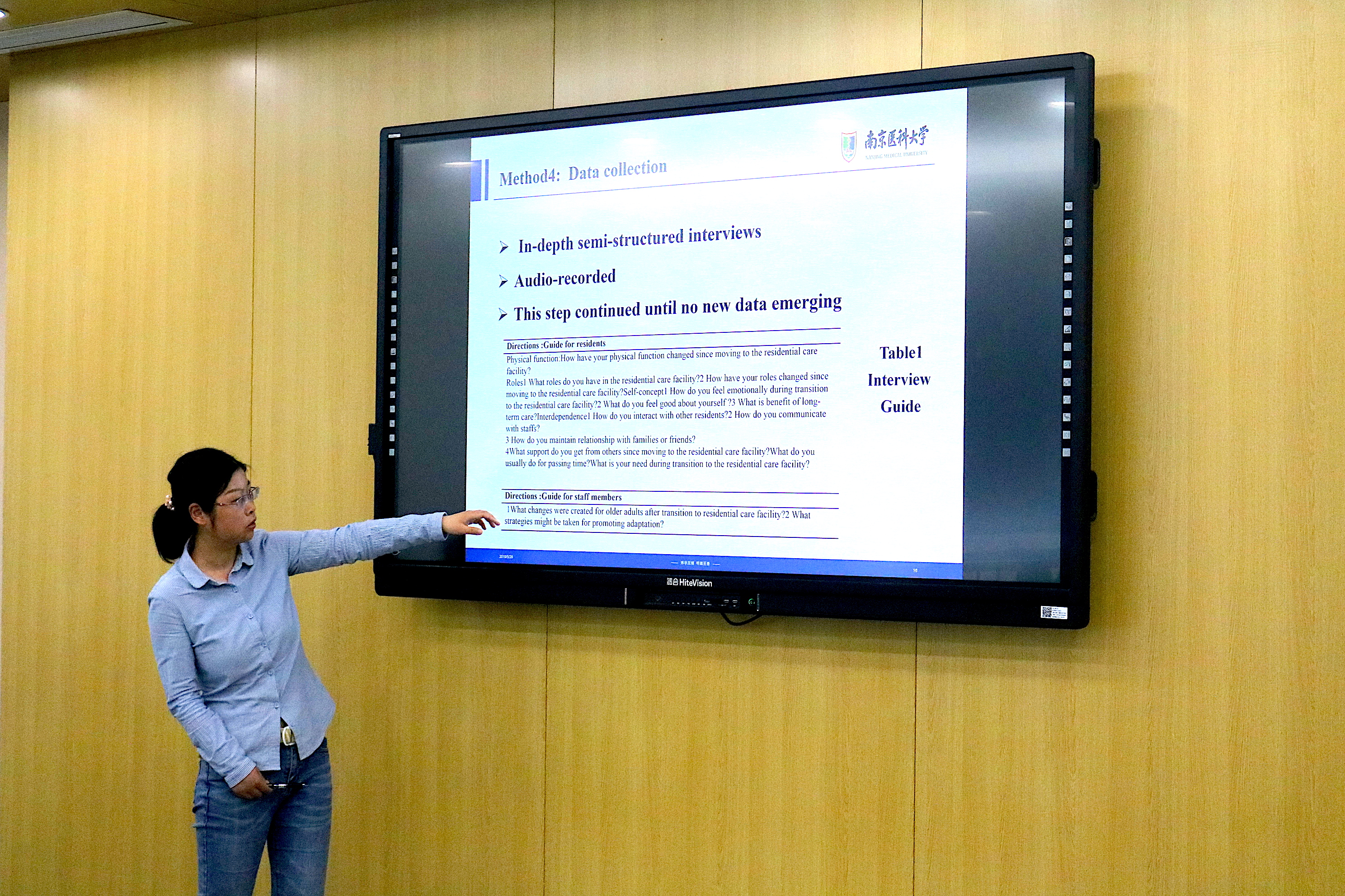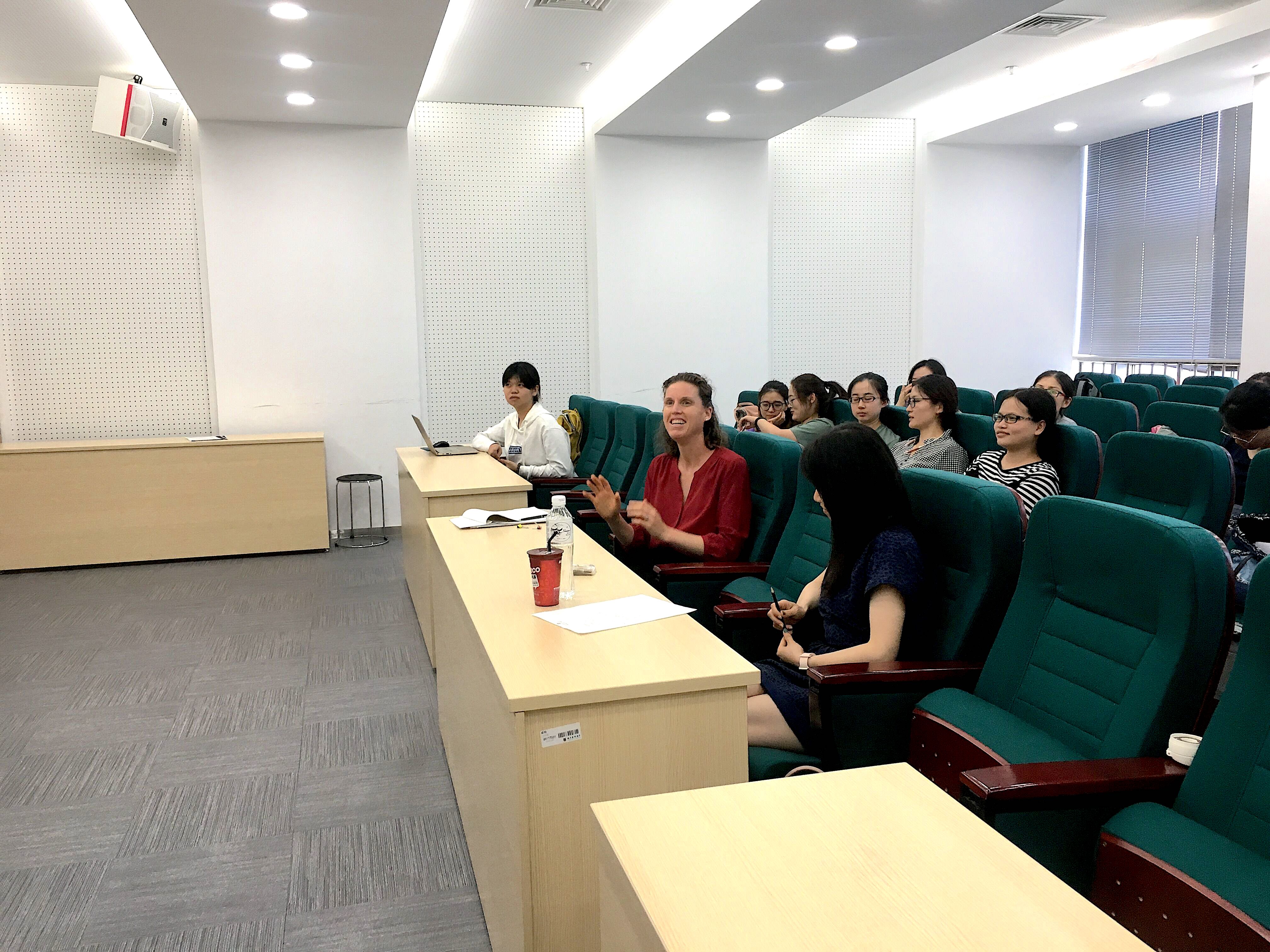 两位在读博士研究生孙昌仙、陈申和四位在读硕士研究生徐欣怡、王静怡、周美景、刘玲珑分别就个人学位课题相关内容进行了汇报。本次课题汇报和点评以纯英文为展现形式,研究生们介绍了学位课题的选题、科研设计、中期进展与后续研究计划等,从研究背景、目的、进展和结论多个方面介绍了自己的研究内容和成果,简述了选题依据、内容、思路、方法等。Katie Haerling博士和宇文薇超博士对六名研究生的表现给予了高度的赞扬,她们充分肯定了该课题的选题、研究思路、前期准备,并就课题的研究重难点、课题界定、理论依据等进行了有效指导,提出了系列建议,对研究中可能存在的困难和问题进行了具体指导。