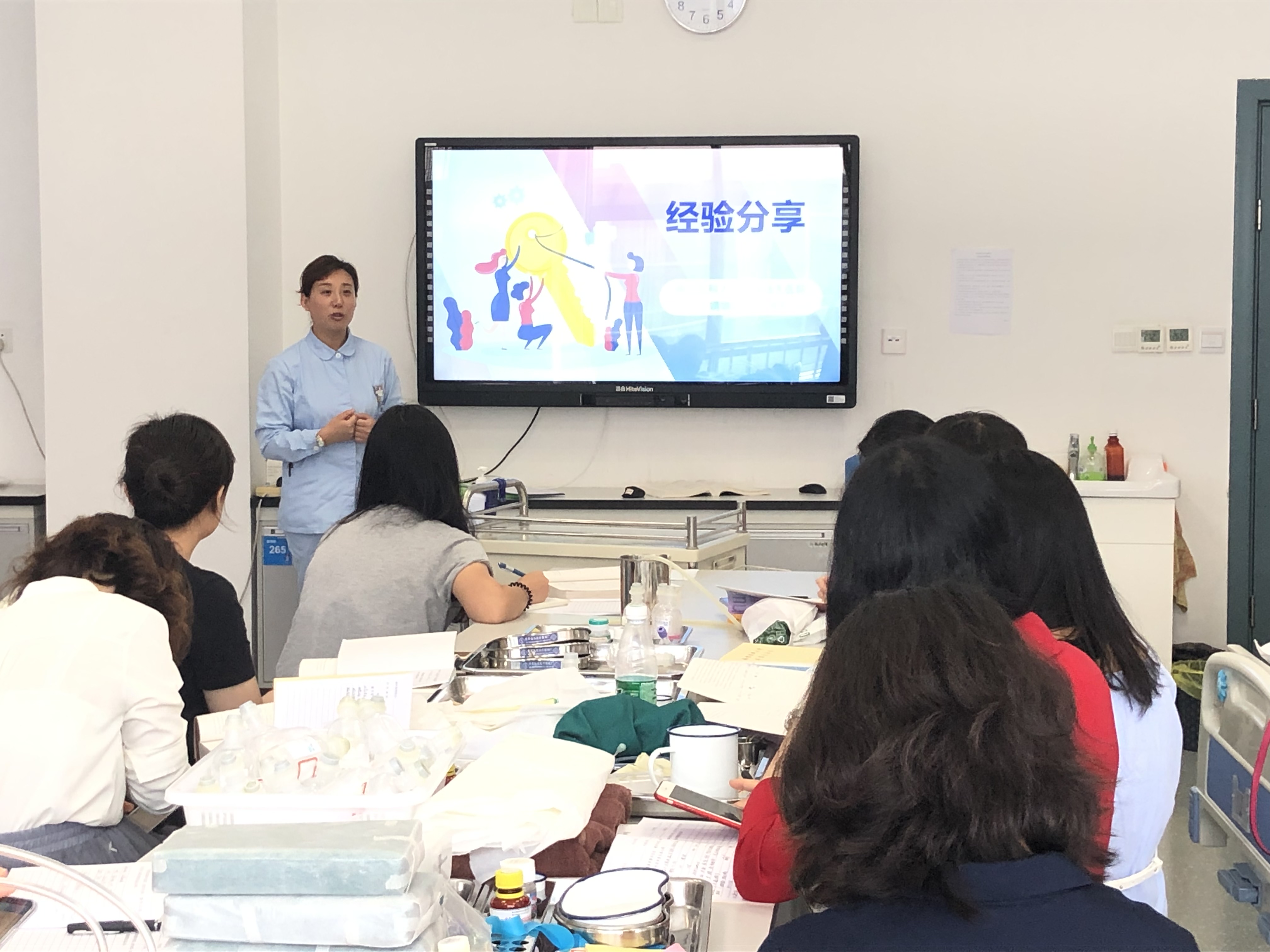 接着,来自附属逸夫医院的丁婧婧老师向大家分享了自己一年来的授课经验。她结合自己教学的实际经历,从课前准备、课堂控制、课后交流等多方面向新任教师分享了教学过程中需要注意的事项,在欢笑中给大家带来了直观的感受。最后,全体新任教师集体参观了护基实验室,详细了解了实验室布局与用途。至此,《护理学基础》新任临床教师培训圆满结束。
