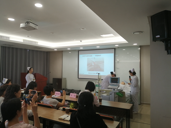 本次活动由教研室副主任(心血管科护士长)常芸主持,活动开始陈玉红主任致辞欢迎,常芸副主任向大家介绍医院情况以及到场参加活动人员。接着,心内科CCU护士长范羽飞带领成中娟、丁娟、韩嫣组成的护理团队为大家生动精彩地演示了一例急性心肌梗死合并室间隔穿孔患者的护理查房。首先范羽飞护士长说明了查房的背景及目的,几名护士分别从病例介绍、知识链接、护理重点、护理体会与探讨几方面展示了查房,并现场演示了主动脉内球囊反搏(IABP)床边交接流程。查房中充分展现了心内科临床护理工作中把循证应用于实践,从护理工作发现科研问题继而开展护理科研工作的锐意进取的态势。