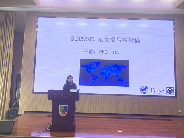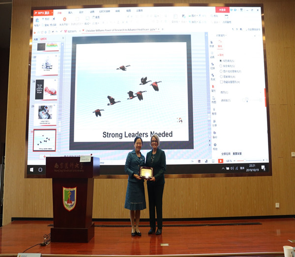 随后,来自美国佛罗里达亚特兰大大学(Florida Atlantic University)的Christine Williams教授带来讲座《Nursing Leadership: Claiming the Future of Healthcare Through Research》,由在读博士陈申同学担任翻译。Christine Williams教授主要讲述了护理领导力在护理工作中的重要性。她用耐人寻味的中国护士的故事阐述了护理教育长期以来的发展趋势,以多个例子说明由于护理者的教育背景、生活经历以及文化等的差异,不同的领导者会有多种不同的领导方式。她还指出,护士应具备批判性思维及创造能力,将研究证据运用于实践。她鼓励同学们攻读护理学博士学位并积极开展循证护理工作。她认为,领导者应挖掘团队潜力,激励团队分享愿景、发挥创造力,勇于面对挑战,引领整个队伍不断前进。最后,她还强调了利用科研的力量来推动医疗保健将成为我们护理人员义不容辞的责任。