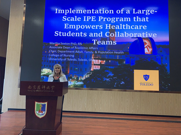 19日下午,论坛精彩继续。来自美国俄亥俄州特雷多大学(University of Toledo)MK体育(中国)的副院长Martha Sexton博士做了题为《Implementation of a Large-Scale IPE Program that Empowers Healthcare Students and Collaborative Teams》的精彩讲座,由我院雷阳老师翻译。跨专业式学习(Interprofessional education, IPE)是指让两个或者两个以上不同专业的人在一起相互学习,以达到增进合作、提高医疗质量的一种教学方法。IPE近年来得到医学界的广泛接受和认同,对于健康照护人员、患者、卫生系统以及学生教育等多方面都有益处。在IPE的引导下,医疗体系开始倡导多专业的协同合作。特雷多大学目前已经大规模开展了IPE课程,Martha博士从IPE课程教学目的、课程设置、质量评估等方面进行了详细介绍,同时还提出了IPE实际教学所面临的班级规模大、知识技能差异等挑战,并给予了相应的建议,为我校开展IPE教学提供了宝贵经验。