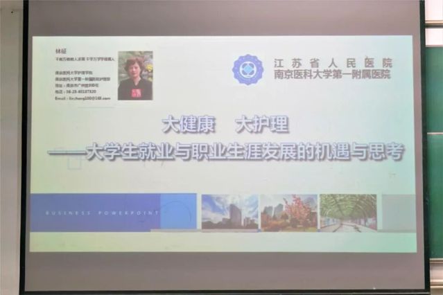 随后,林老师对护理专业的现状进行了分析:护理队伍不断壮大且结构优化、教育规范且层次完善、服务能力大幅提升、科学研究持续提速、学术期刊繁荣发展、国际影响力也在不断彰显。护理专业本科生的就业前景与各个专业相比,拥有极大的优势。