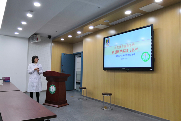 随后,汪璐老师为大家做了《护理教师视角下的护理教学实践与思考》的主题演讲。汪老师用她丰富的教学经验,绘声绘色地为与会者介绍了自己对护理学生、护理临床、护理教师以及护理教学的思考,并就护理学理论授课和见习的带教等方面分享了自己的心得与体会,为给大家为今后的护理教学带来很多启示。