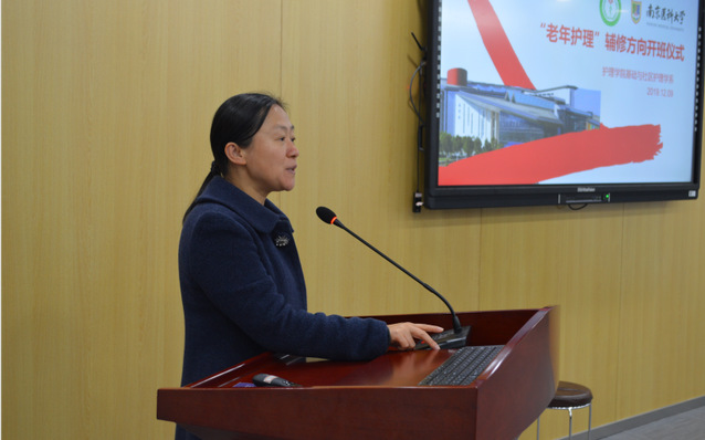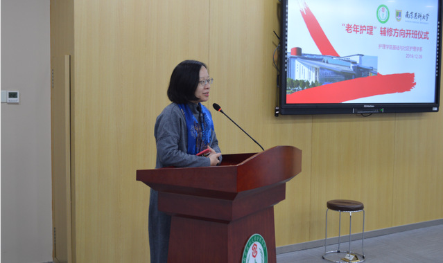 首先,丁亚萍老师介绍了学院开设辅修方向的整体情况,并结合2018年护理学类教学质量国家标准与2019年学校人才培养方案修订,介绍了“老年护理”辅修方向的培养目标、课程设置、师资队伍及学生培养要求等。随后,许勤老师在讲话中对“老年护理”辅修方向的开班表示祝贺,指出辅修方向的开设是拓展护理学专业人才培养方向的积极探索,并对选择“老年护理”辅修方向的同学们提出殷切期望。她希望同学们通过辅修方向课程的学习能有更多收获,为今后争取更多的职业发展优势奠定基础。