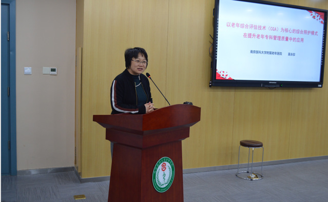 开班仪式结束后,“老年护理”辅修方向负责人附属老年医院莫永珍主任进行了题为“以老年综合评估技术为核心的综合照护模式在提升老年专科管理质量中的应用”第一讲。莫永珍老师分别从课程背景、老年人常见健康问题、老年综合评估的含义及应用、老年综合照护模式具体实施流程和项目结构及推广价值,对课程内容进行开篇介绍。