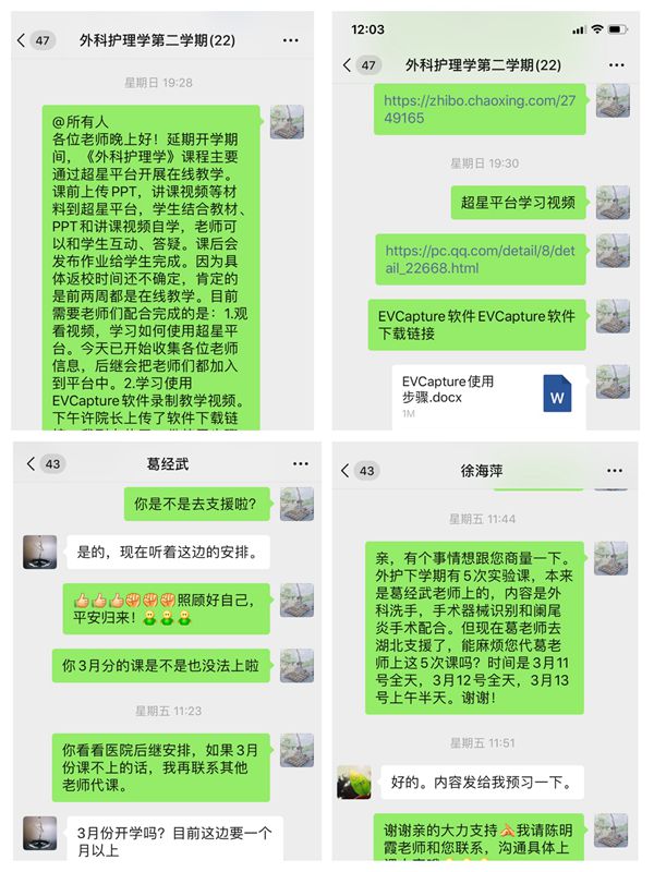 控制疫情非常时期,《外科护理学》全体教师积极响应学校停课不停教、停课不停学、教学不延期的指示,采取一系列措施确保延期开学期间教学工作平稳有序开展。