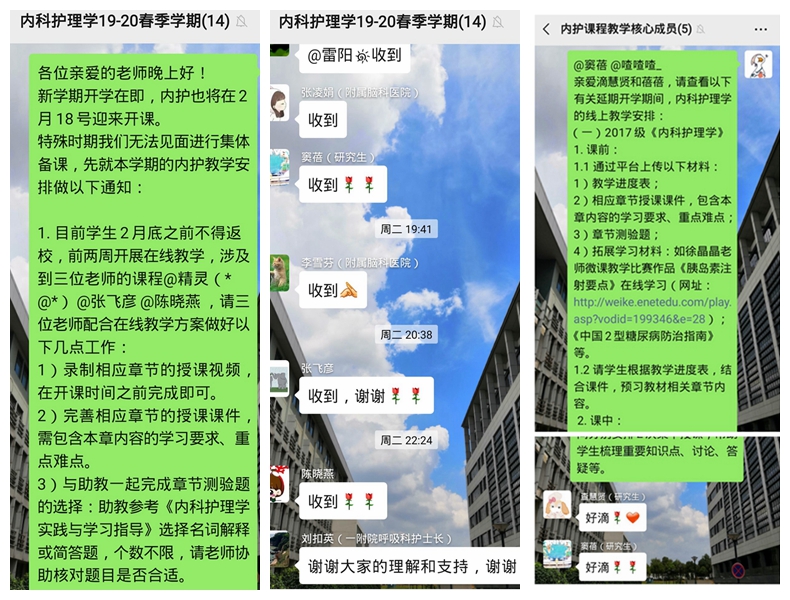 内科护理学课程组的大部分任课老师来自于临床一线,在疫情防控的攻坚时期,她们坚守在战疫最前线的同时,克服各种困难,积极响应学校的工作方针,努力完成备课、录课、答疑等各种任务、保质保量地推进内科护理学的教学工作。研究生助教也积极投入到课程的管理中来,负责资料上传、作业批改、学生意见反馈等,为课程的开展保驾护航。相信在党和政府的领导下,我们一定能够打赢这场疫情防控阻击战,春暖花开之时,重聚南医校园!
