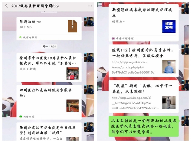 在这种形势下,临床教师们利用下班时间,进行备课、教案的书写、课件的制作、教学视频的录制,并把本次防疫工作在教学中给予体现,将防疫新知识点及本院护理人员支援武汉的讯息分享给学生,启发学生的使命感、责任感。