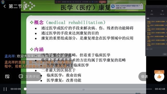 2月17日上午8:50,扬州临床医学院开学第一课准时开课,苏北人民医院北区分院院长孟兆祥老师在钉钉直播互动教学,讲授《康复护理学》第一课:康复的基础理论。由于前期课程负责小组与同学们做了充足的试播尝试,因此直播十分顺利。