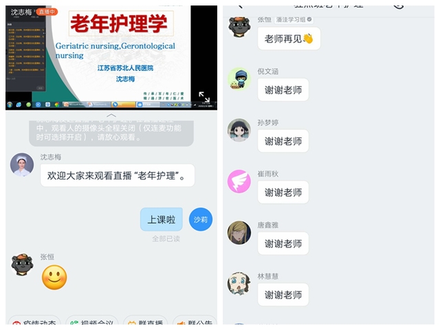 《老年护理学》的第一课由老年医学科护士长沈志梅主讲,从大年初四至今,护士长一直坚守在工作岗位,不曾休息。为了给学生们呈现最佳的教学效果,护士长早早地与大家建立了钉钉群,并不断摸索,多次尝试,最终直播教学圆满完成。尽管过程很耗时耗力,护士长说:“同学们的认真听讲就是对老师辛苦付出最好的支持与回报。”