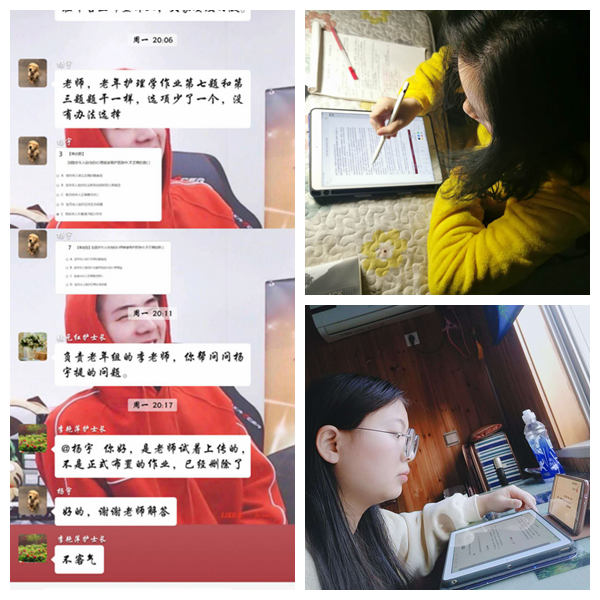 开学首日,医院教学工作实施有序,监督有力,各门课程顺利开展。同学们按时登录超星平台,学习《外科护理学》老师提前录制好的教学视频。《康复护理学》课程利用QQ群上传教学资料,线上教学顺利进行。微信群内,同学们积极提问、互动,学习热情丝毫不减,学习秩序严肃活泼而不乱。为保证教学质量,各门课程采用课后作业考察、课后提问答疑等方式,保证了学生的学习效果。