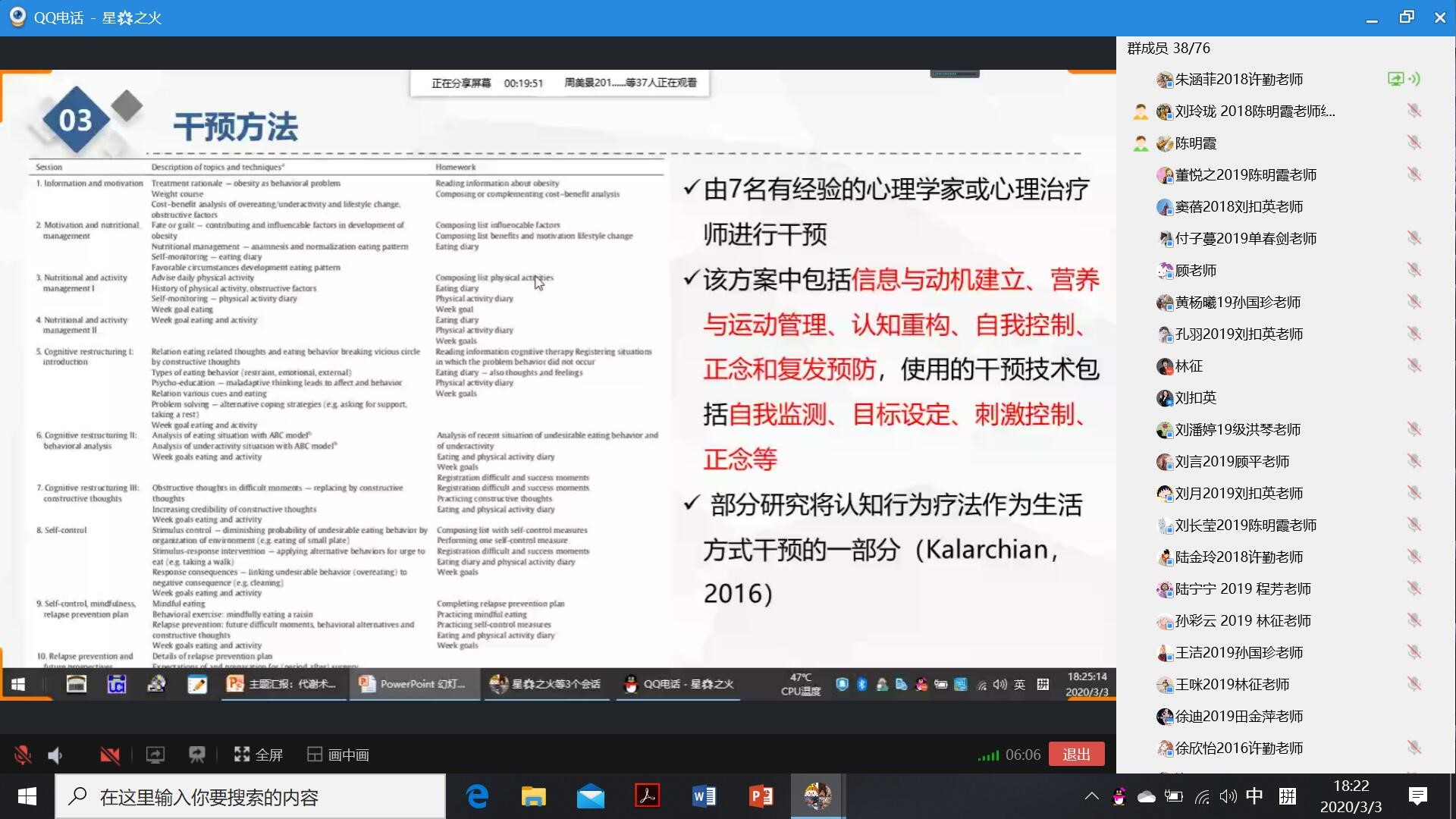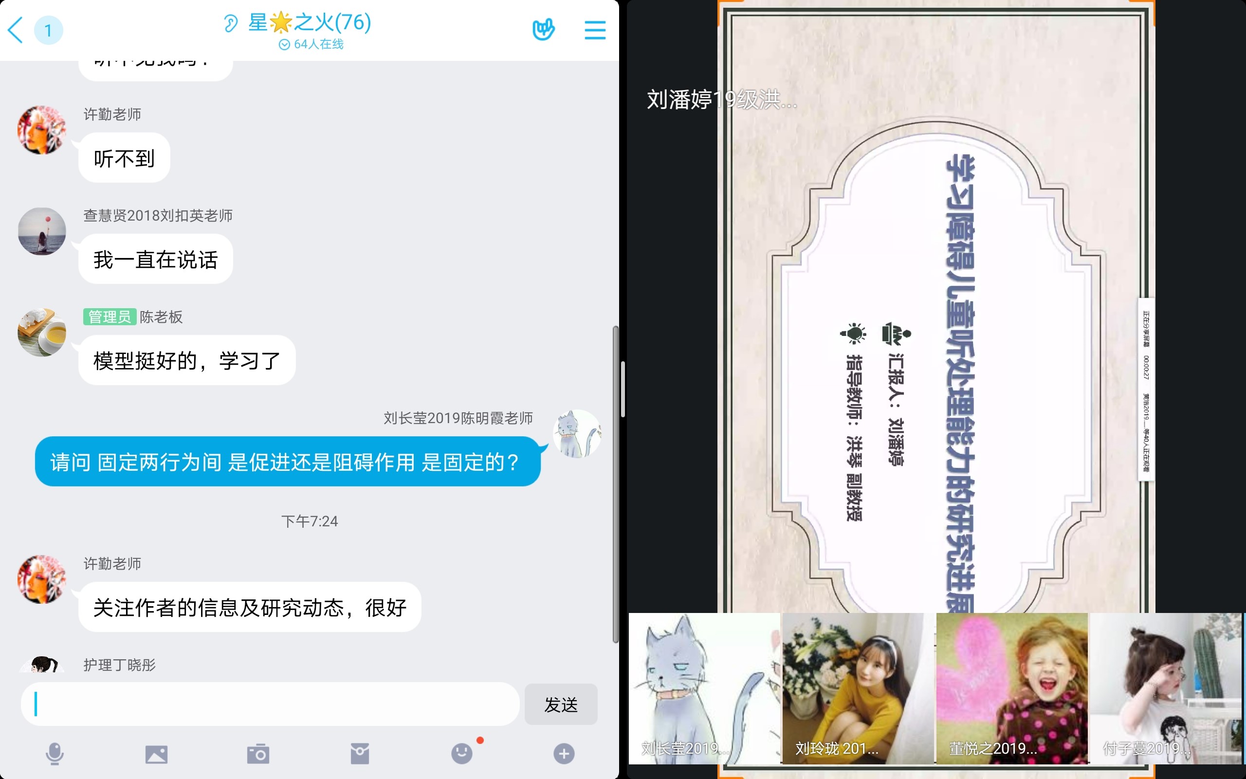在报告过程中,老师和同学们积极在群中提出问题,进行交流,或者表达赞扬,气氛很是活跃。同学们有序汇报完毕,刘玲珑同学主持闭幕,并请老师点评。许勤老师指出,同学们在疫情期间,排除万难,坚持科研学习,很是让人感动,希望同学们能够再接再厉。陈明霞老师,刘扣英老师表示同学们的读书报告值得夸奖,不管是内容还是框架,都很出色,希望,同学们在家学习的同时保重身体,特别是在一线的同学,要注意安全、做好防护。