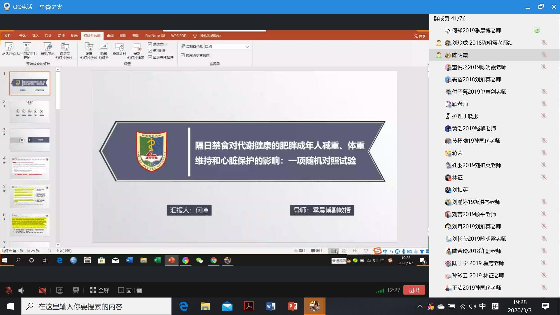 随后报告的是以“隔日禁食对代谢健康的肥胖成年人减重,体重维持和你心脏保护的影响:一项随机对照试验”为主题的2019级研究生何瑾同学。