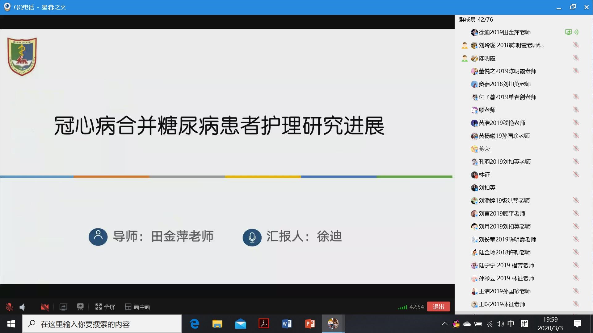 为保证“停课不停学”、“学习不延期”,202033号下午6点,我院临床护理学系首次在网络平台顺利展开研究生读书报告会,本次读书报告的主持人为刘玲珑,查慧娴同学,参与的老师有许勤,顾平,刘扣英,陈明霞,孙国珍,丁晓彤等,参与的同学有朱涵菲,徐迪等,共计39名同学。